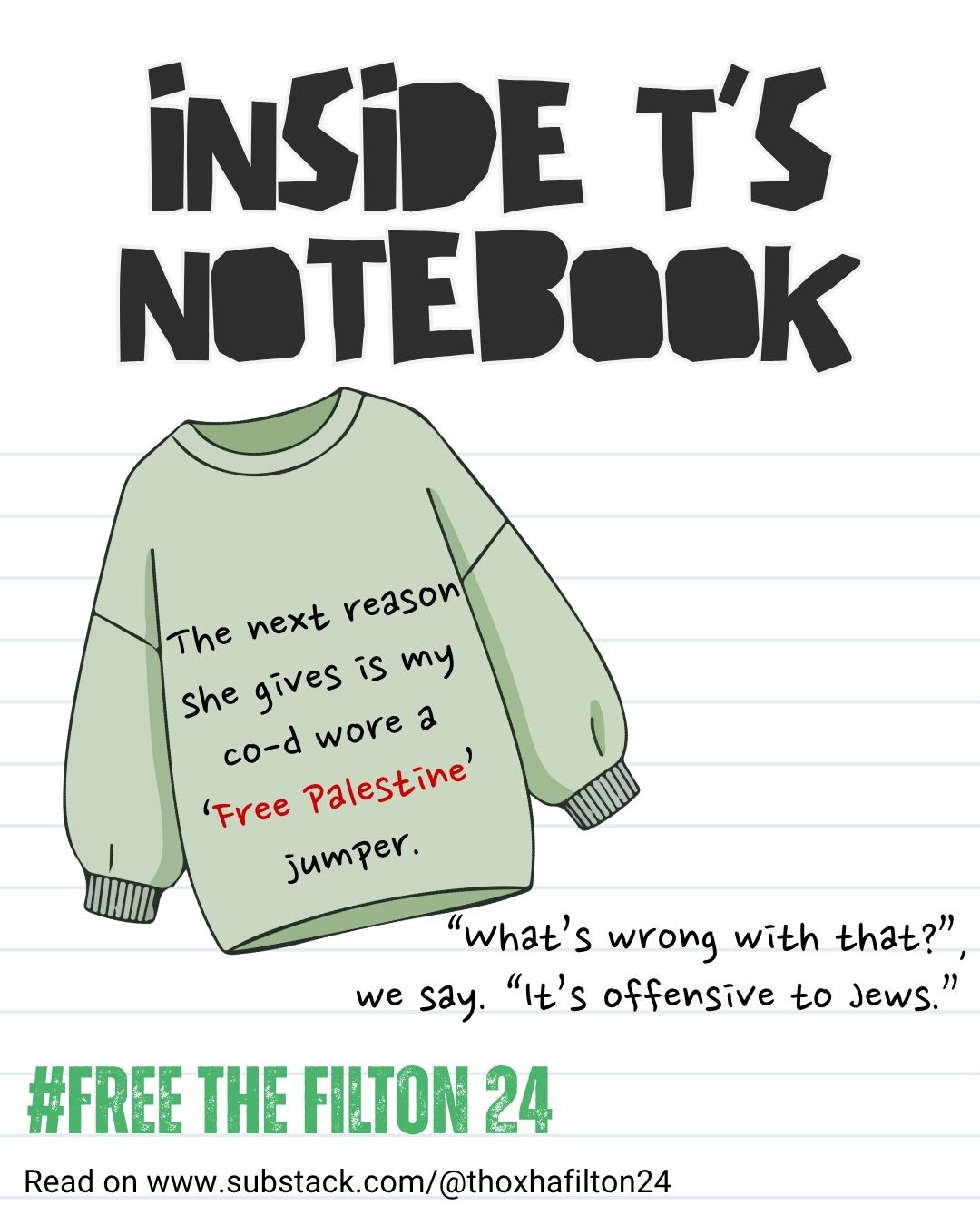 I asked security about the visit cancellation. She tells me and the other’s visits are being restricted from a daily allowance to 3 a week, the legal minimum for remand. We ask why; we get several non-reasons such as ‘we take up the visits it’s not fair on the other prisoners’. “How can that be when the hall is sparse when we have visits?” The next reason she gives is my co-d wore a ‘Free Palestine’ jumper. “What’s wrong with that?”, we say. (The guard said) “It’s offensive to Jews.”