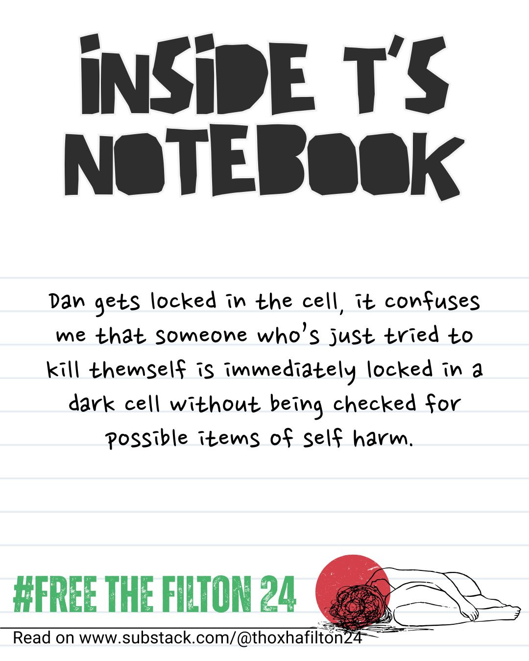 Around 3:40pm I hear a commotion on the landing, like several voices shouting. I open the cell door and in my eye line is Dan, their face is a dark purple. I didn’t see the ligature on the neck until seconds later. It’s so tight that Dan is wheezing.