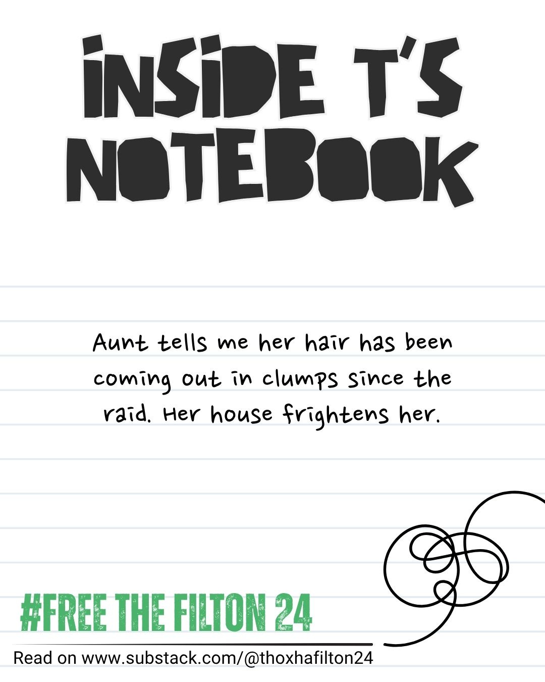 Aunt tells me her hair has been coming out in clumps since the raid. Her house frightens her.