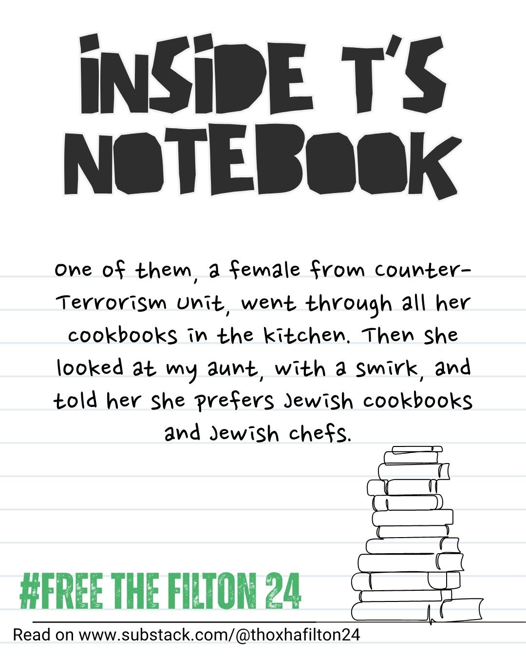 She thinks there were around 20 officers combing the house over several days. One of them, a female from Counter-Terrorism Unit, went through all her cookbooks in the kitchen. Then she looked at my aunt, with a smirk, and told her she prefers Jewish cookbooks and Jewish chefs.
